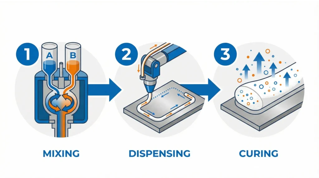 | 3 | Material Mixing | Two-component PU or silicone is precisely metered and mixed in the dispensing head. |