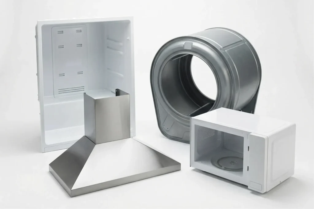 Inner liners, outer panels, drum housings, and structural frames for refrigerators, washing machines, range hoods, and small appliances. Pre-painted and stainless steel available.