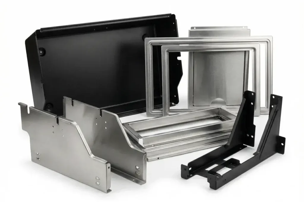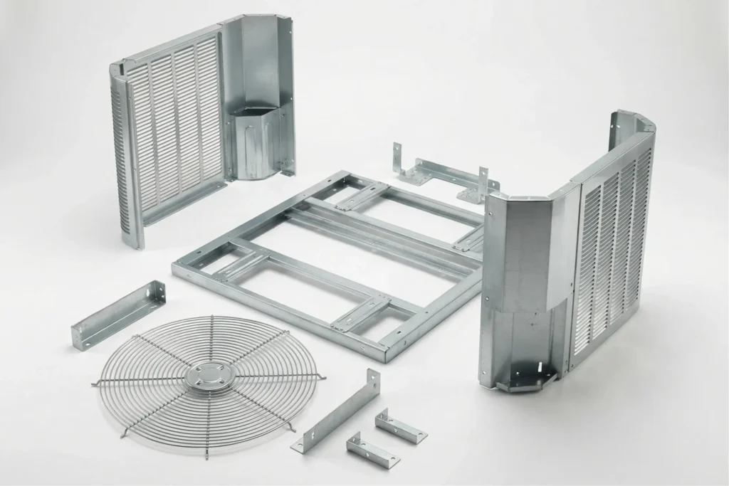 High-volume chassis, side panels, fan guards, and mounting brackets for outdoor AC units and commercial HVAC systems. Galvanized and pre-painted steel processed at scale.