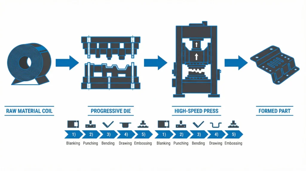 Metal stamping is a manufacturing process that uses dies and high-pressure presses to form flat metal sheets or coils into specific shapes, including blanking, punching, bending, drawing, and embossing. It is the most cost-effective method for producing identical metal parts at high volumes.