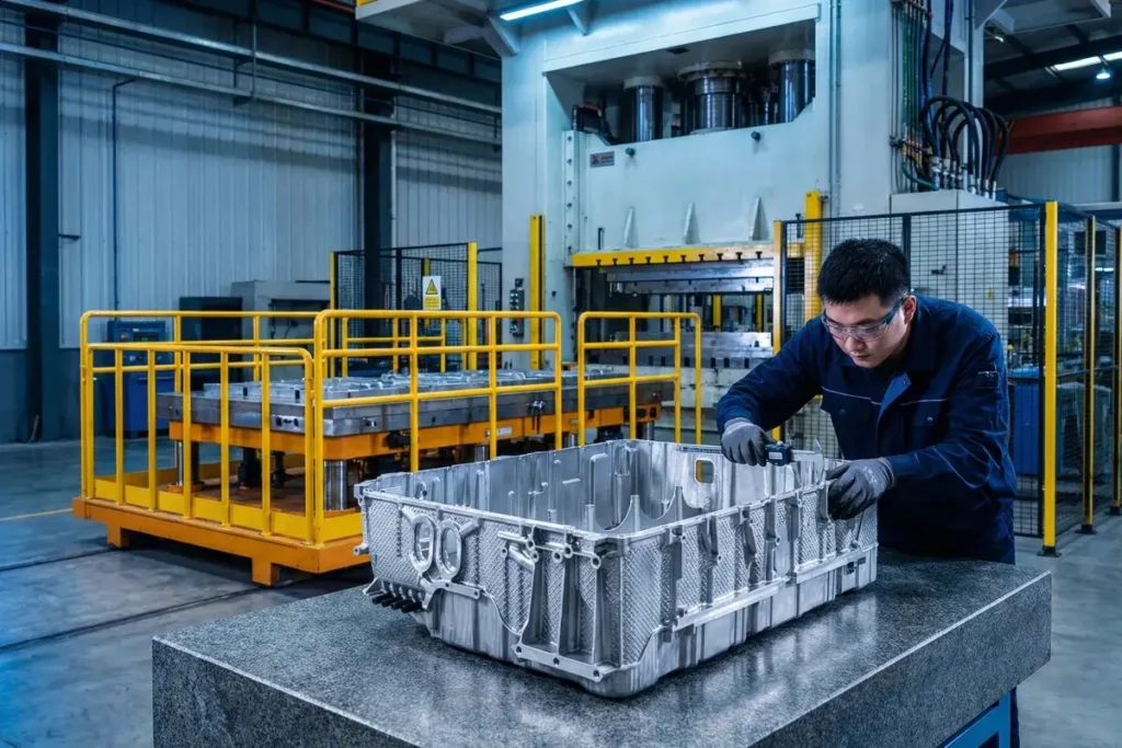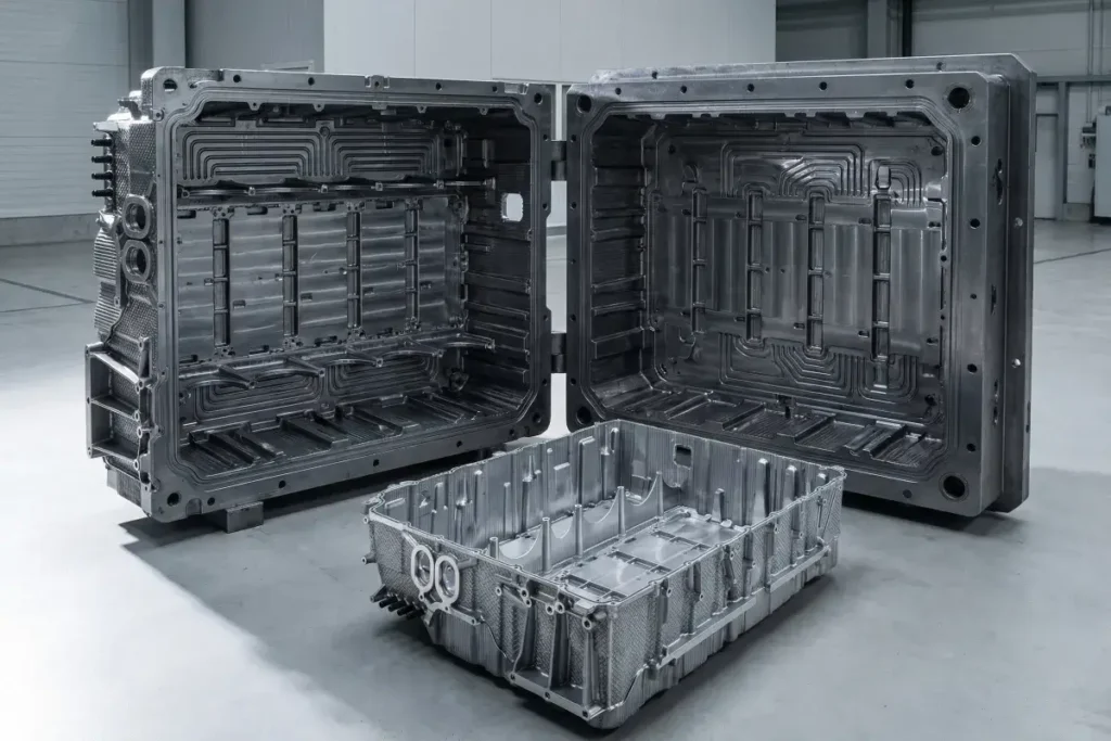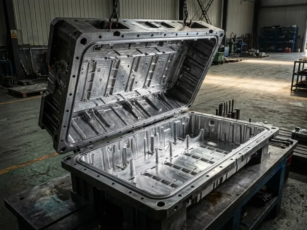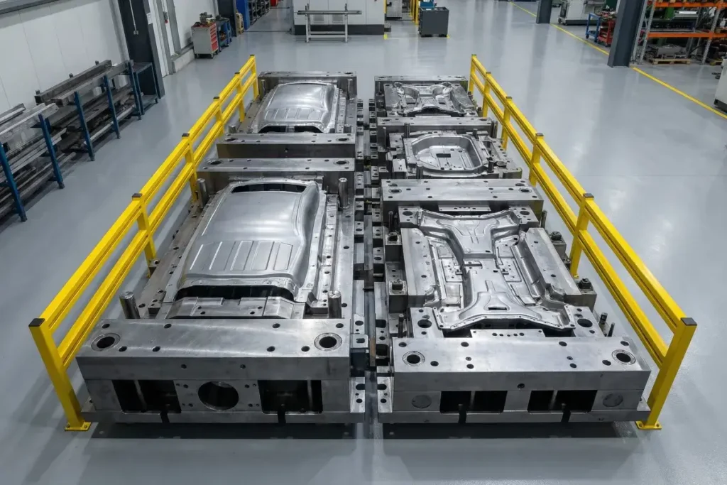 Pressure casting molds for aluminum and zinc alloy components, built up to 1.8m × 1.5m. Used for automotive structural parts, EV battery housings, inner/outer body panels, and sunroof frames.