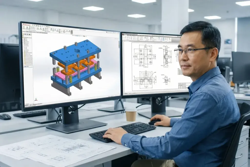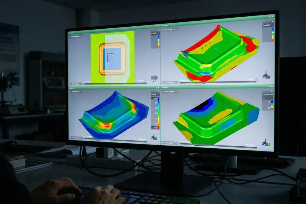 Our engineering team works across SolidWorks, UG (NX), Pro/E, AutoCAD, and SheetWorks for 2D/3D die design and flat pattern development. We use AutoForm for forming simulation, predicting material flow, springback, and thinning before machining begins.
