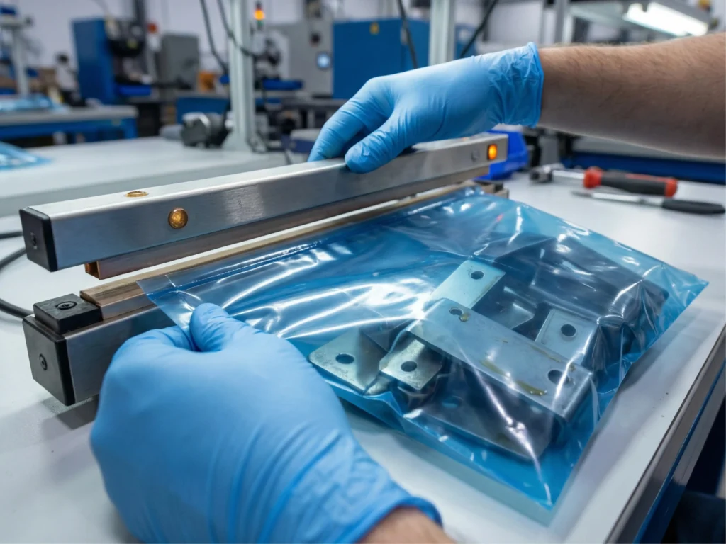 For bare metal parts shipped by sea, we use VCI (Volatile Corrosion Inhibitor) bags and anti-rust paper combined with silica gel desiccant packets. Parts are sealed in PE barrier bags to control humidity exposure during the 20–35 day transit period.