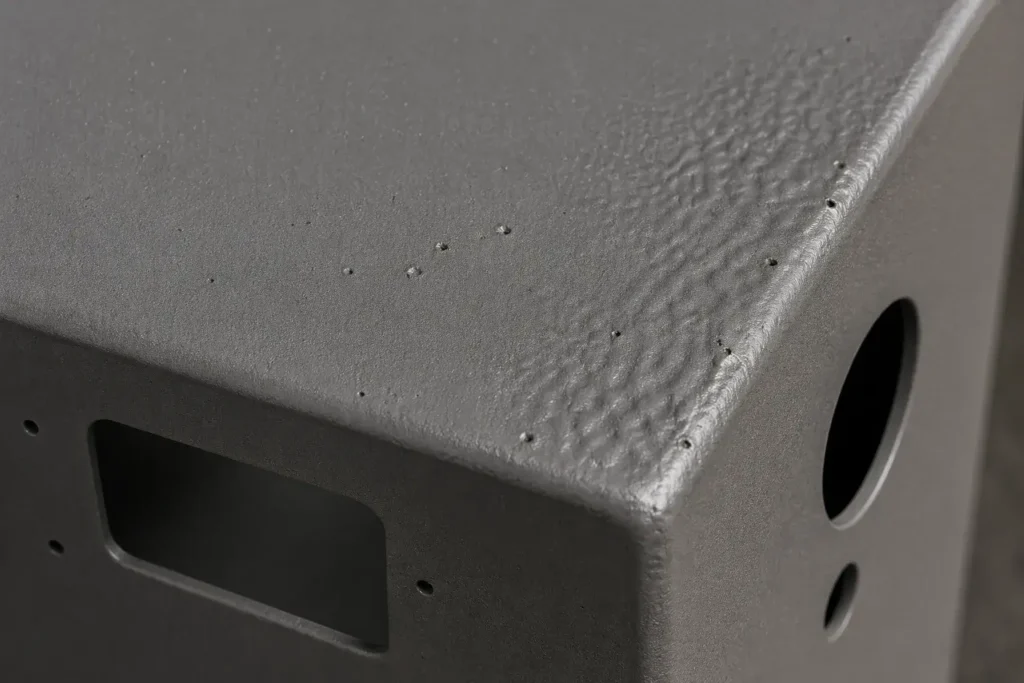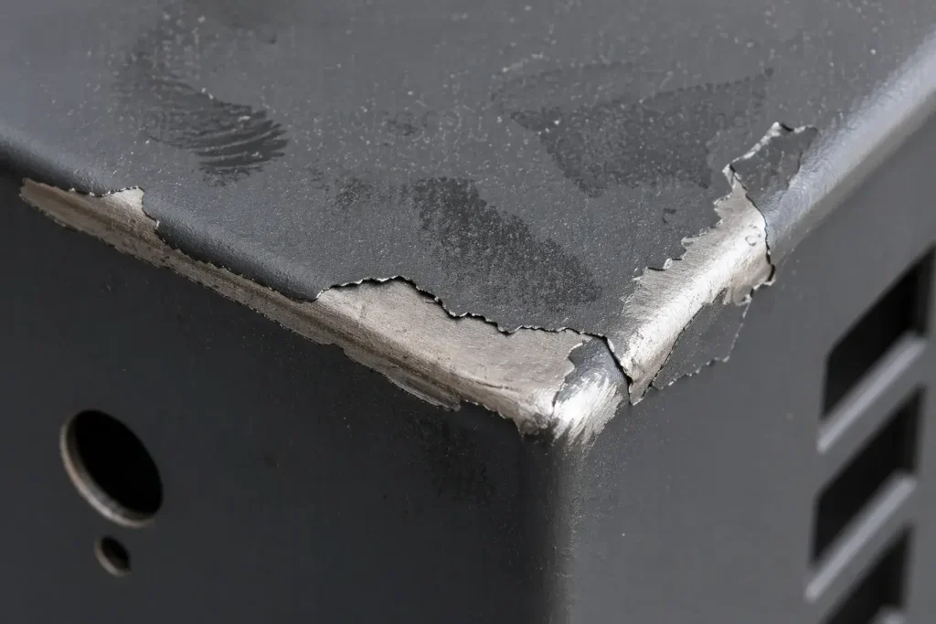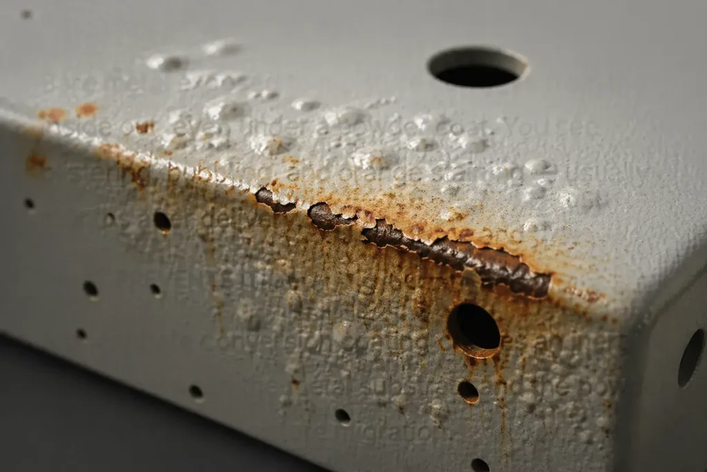 Bare metal exposed to moisture corrodes from the inside out, even under a powder coat. You see blistering, bubbling, and orange staining — usually months after delivery.