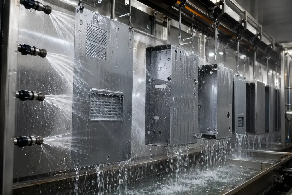 Multi-stage rinsing — including a final deionized water rinse — leaves behind a chemically neutral, contamination-free surface ready for powder application.