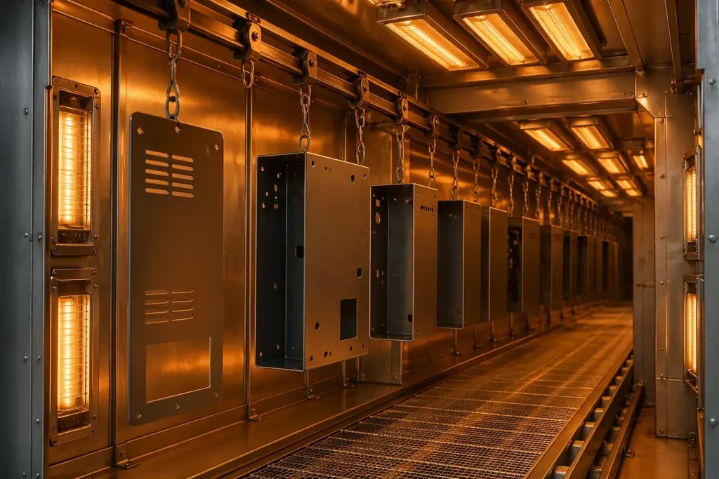 Pre-treatment is the most overlooked step in any coating process and the most common cause of coating failure. Our inline spray wash system removes forming oils, deposits a phosphate conversion layer, and prepares every surface for powder application. As an integrated stage of our surface finishing process, it runs automatically on the same conveyor that carries your parts from wash to booth to oven — with zero gap between steps.