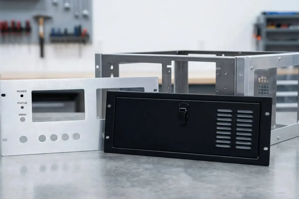 Equipment front panels, access panels, and chassis frames with precision cutouts and custom finishes for OEM applications.