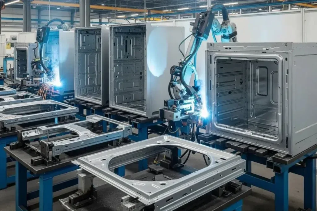 HVAC condenser frames, automotive brackets, appliance housings, or any assembly requiring dozens of joints per part at production volumes.